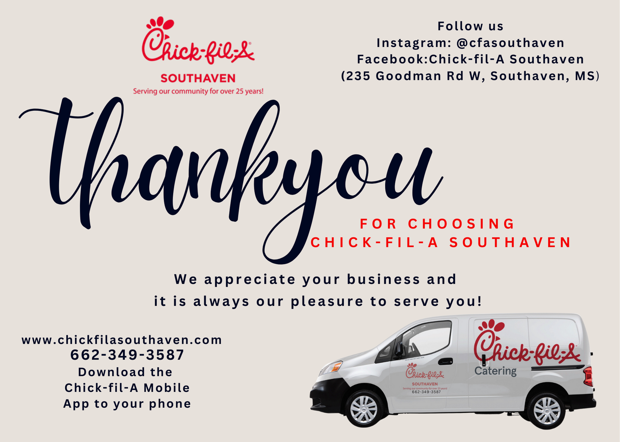 Thank you for your interest in partnering with Chick-fil-A Southaven located near I-55 on Goodman Rd. We proudly support our community and take great pride in working with our local schools and organizations within Desoto, Tate and Shelby counties to help achieve their fundraising goals.